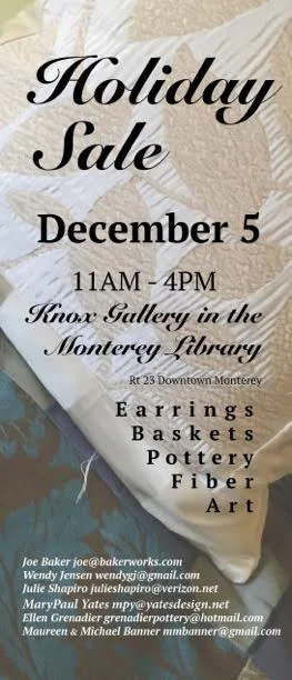 Just in time for the holidays, art and objects by some of Monterey’s popular artists and makers will be offered for sale here at the Knox Gallery/Monterey Library on Saturday, December 5th, from 11 a.m. to 4 p.m. Please come meet the artists and makers, and peruse earrings by Maureen and Michael Banner, baskets by Wendy Jensen, pottery by Ellen Grenadier, fabric and decorative pillows by MaryPaul Yates, and art by Joe Baker and Julie Shapiro.